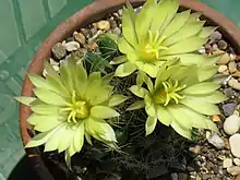 Mammillaria sphaerica, the longmamma nipple cactus or pale mammillaria[1] is a species of flowering plant in the cactus family Cactaceae, native to south eastern Texas in the USA and north eastern Mexico, where it occurs in scattered patches at altitudes up to 1,000 m (3,300 ft).[4] It forms clumps of small pale green spheres (whence sphaerica) to 5 cm (2.0 in) in diameter, with short hairs and pale yellow flowers up to 3 cm (1.2 in) wide in summer.