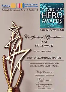 Mahtab has received several awards for his contribution during COVID-19 pandemic including ‘Health Care Heroes Award 2020’[34] from Walton Group, Bangladesh, ‘Global Business CSR Award 2021’[35] from Bangladesh American Chamber of Commerce & Youth Commerce Communication International, ‘Wonca Global Healthcare Leadership Award 2021’[36] from World Organization of Family Physicians (Wonca), ‘COVID-19 Hero Award’[37] from Rotary International Zone 1B, Region 10.