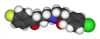 Space-filling representation of a haloperidol molecule. Haloperidol is an antipsychotic medication sometimes used to treat severe cases of Tourette's.