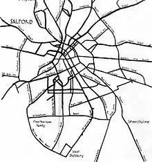 The central and south-central Manchester area had one of the densest concentrations of tram services of any urban area in the UK.[4] MCT services ran up to the edge of routes provided by other operators in (what is now) Greater Manchester, and in some instances had running rights over their lines and vice versa. There were extensive neighbouring systems in Salford, Oldham, Ashton, Hyde, Middleton, Rochdale, and elsewhere.