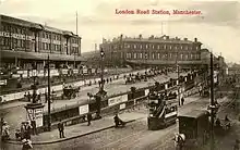 An MCT tram in front of Manchester London Road station in the 1900s.