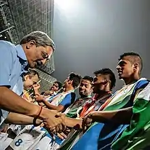 Dessai shaking hands with Manohar Parrikar at the 2014 Lusofonia Games