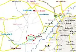 Mandi Faizabad (منڈی فیض آباد) is a small town of Nankana Sahib District in Pakistan. Mandi Faizabad old name was Dhoka Mandi and when Noor Muhammad Khuaja almaroof Haq Peer Mitha Sai De Darga NoorPur Shareef (Sindh) came here he proclaimed his new name to be Mandi Faizabad because here Disbursement of 'Faiz Haq Peers Mitha Sai began. A flourishing and lush green town famous for its vegetables, fruits, flowers, greenery, meadows and gardens. It is situated on Jaranwala road 45 km from Lahore and 33 km from first exit of Lahore-Islamabad Motorway (M2). The city of the famous saint Mian Sher Muhammad Sharaqpuri[2] Sharaqpur Sharif is 13 km away from Mandi Faizabad towards Lahore. Mandi Faizabad is the economic hub of the area having a number of rice processing units and rice markets which provides fine quality rice to the whole of Pakistan as well as job opportunities to the people of the area.