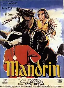 Mandrin is a 1947 French historical adventure film directed by René Jayet and starring José Noguéro, Armand Bernard and Mona Goya.[1] It is based on the life of the eighteenth century French brigand Louis Mandrin.