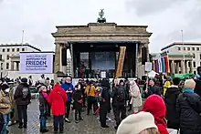 The petition quickly reached several hundred thousands signatures, was accompanied by the demonstration Aufstand für Frieden that drew around 13,000 people to the Brandenburg Gate on 25 February 2023, and caused intense debate in the German media.[2] People from mainstream media and political parties accused Wagenknecht and Schwarzer of repeating Russian propaganda and of not sufficiently disavowing right-wing populists who also oppose the arms deliveries.[3][4][5]