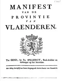 The Manifesto of the Province of Flanders (1790 Dutch: Manifest van de Provintie van Vlaenderen; modern Dutch: Manifest van de Provincie Vlaanderen) was the declaration of independence of the county of Flanders on 4 January 1790, during the Brabantine Revolution. On this day, the States of Flanders "solemnly declare[d] in the name of the People, the province of Flanders to be an independent State, and definitively withdrawn from its loyalty and obedience to emperor Joseph II, count of Flanders, and from the House of Austria."[1] The States also declared "all officials, lieges and other servants, whoever they may be, free and absolved from all concluded and indebted contracts, and discharged from every oath done to the fallen count of Flanders."[2]