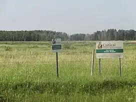 ![]() Signs identifying a section of the Tall Grass Prairie Preserve as critical habitat. | |