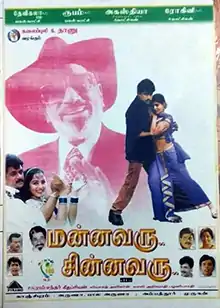 Mannavaru Chinnavaru is a 1999 Indian Tamil-language drama film directed by P. N. Ramachandra Rao.[1] The film stars Sivaji Ganesan, Arjun and Soundarya, while Maheswari, Visu and K. R. Vijaya play supporting roles. This is the 100th film for Arjun.[2] The film was a remake of Telugu film Subhavartha, with Arjun and Soundarya reprising their roles from the original version, after Arjun expressed his interest further in remaking the film.