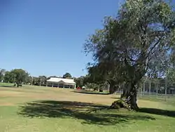 ![]() View of Manners Hill Park showing the pavilion, peppermint trees and a tennis court | |