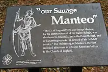 Manteo is recognized as being the first Native American who became an Anglican Christian.[5]: 355 Manteo was possibly converted to Anglican Christianity by Raleigh. Some historians believe that Raleigh promoted this as a political maneuver to further Manteo's role in working with the English. Upon conversion, Manteo retained his given name.[6]: 190 Manteo may have assisted in helping the English convert other Native Americans to Christianity as well.[5]: 351 In 2008, the 125th Annual Convention of the Episcopal Diocese of East Carolina approved the commemoration of the Baptism of Manteo, along with that of Virginia Dare, to be kept on August 17 of each year.