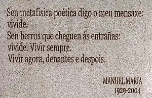 Manuel María Fernández Teixeiro, better known as Manuel María (October 6, 1929, Outeiro de Rei–September 8, 2004, A Coruña), was a Spanish poet and academic who wrote in the Galician language. He was notable for his combative character and his political commitment.[1][2] His poetry touched on themes of love, art, his own political commitment, drawing attention to wrongs, ethnography, physics, history, immateriality, mythology, the animal world, poetic expression, the passing of time, religion, society, language, agricultural labour, urbanism, and geography. The Day of Galician Literature was devoted to him in 2016.[3]