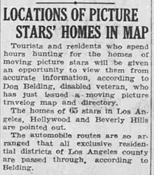 The earliest Hollywood star maps were created in the 1920s,[3][5] with some movie studios "producing their own maps with directions to their stars' homes, cultivating the idea of celebrity and encouraging fans to see them as icons".[5] A 1924 Los Angeles Evening Post-Record article describes, for example, how "tourists and residents who spend hours hunting for the homes of moving picture stars will be given an opportunity to view them from accurate information", from a map showing "homes of 65 stars in Los Angeles, Hollywood and Beverly Hills".[6] A noted 1926 map of celebrity homes produced by developed George E. Read had a different purpose, to promote the marketing of residential properties in the area by highlighting their proximity to the stars.[5]