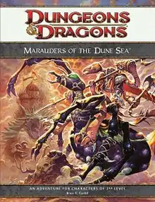 Marauders of the Dune Sea, by Bruce R. Cordell, is the official Dark Sun adventure for 4th edition Dungeons & Dragons, and was published by Wizards of the Coast in August 2010. A sequel adventure, Revenge of the Marauders, by Cordell was published in Dungeon #183 (October 2010). On July 21, 2015, Marauders of the Dune Sea was re-released as a PDF.[2]