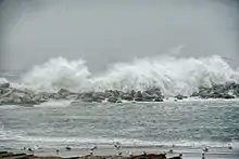 The March 2010 nor'easter or St. Patrick's Day nor'easter was a powerful nor'easter that impacted the Northeastern United States and Eastern Canada from March 12–16, 2010, resulting in at least nine deaths. The slow-moving storm produced over 10 inches (25 cm) of rain in New England, causing widespread flooding of urban and low-lying areas. Winds of up to 70 miles per hour (110 km/h) snapped trees and power lines, resulting in over one million homes and businesses left without electricity. The storm also caused extensive coastal flooding and beach erosion.[1] The nor'easter was the fifth major winter storm to impact the Mid-Atlantic and New England in the 2009–10 North American winter storm season.