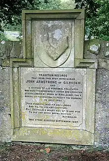 The effectiveness of March law depended heavily on the energy and probity of the Warden-Conservators and their deputies (many of both of which were in league with the reivers). An example of the continual problem (almost the continual impossibility) of enforcing the law is given in the preamble to the 1563 indenture, which bemoans the "negligence of some officers, and lack of due execution of the laws and orders of the said marches of both the realms".[41] Frustration and vendettas sometimes led to lynch law, outside the ambit of March law, an example being King James V's order to hang Johnnie Armstrong and his followers without trial in 1530.