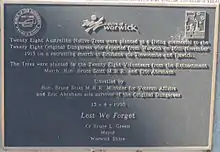 In April 1998, a re-enactment March of the Dungarees left Warwick on 13 April to arrive as part of the Anzac Day march in Brisbane on 25 April.[32] Warwick Shire Council celebrated the occasion by planting an avenue of 28 native Australian trees to commemorate the 28 original "dungarees" who departed from Warwick on 16 November 1915. A plaque was unveiled on 13 April 1998 by Bruce Scott, Minister for Veteran Affairs and Eric Abraham (Queensland's last surviving recruit from the March of the Dungarees).