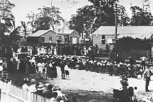 A large crowd gathered and cheers rang out, as did the fog-signals from the trains in the Woolloongabba railway yards (now part of the South East Busway).[27] The Railway Band led the march of the Dungarees down Stanley Street on 30 November 1915. Enthusiastic crowds gathered in every doorway and veranda, and flags fluttered overhead.[28]