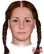 The woman had been between 5 ft 4 in (163 cm) and 5 ft 6 in (168 cm) in height, aged between eighteen and twenty-six, and weighed 125–130 pounds (57–59 kg).[20][21] She had naturally reddish-brown hair, which was parted in the middle and braided into pigtails on both sides of her head.[9][10][21][20] Her eyes were light brown in color, and she had freckles across her face.[9] In addition, her nose was described as being "very pointed".[22] The victim also had a ruddy complexion, indicating she had spent a lot of time outdoors in the final weeks or months of her life.[9][23]