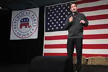 Campaigning in South Carolina on February 11, Rubio charged Trump and Bush with having no foreign policy experience and acknowledged John Kasich as experienced in that regard, but not having been involved with foreign policy "in a long time."[72] Rubio participated in the February 13 CBS News debate, exchanging with Cruz over the latter's claim regarding Rubio's comments in Spanish during an appearance on Univision. Rubio responded by claiming that Cruz did not know how to speak Spanish, Cruz retorting through speaking the language. The following day, February 14, Rubio denied that he was attempting to call into question Cruz's legitimacy as a Latino, instead having meant to question if he understood him and, he added, regarding Cruz, "He's just going off what other people are telling him, and it's false. It's just not true."[73] On February 17, Governor of South Carolina Nikki Haley endorsed Rubio.[74] Haley's endorsement was seen as helpful to Rubio, exit polls after the primary having one in four voters indicate that they had supported Rubio only after the governor's endorsement.[75] In the South Carolina primary on February 20, Rubio finished in second place at 22%,[76] but won zero delegates from the state.[77] Jeb Bush came in fourth place and then suspended his campaign.[78] In his speech afterward, Rubio said the primary had "become a three person race, and we will win the nomination".[79]