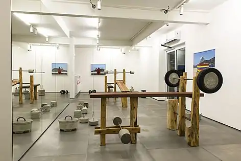 This work is an installation made of wooden, metal, concrete and plastic elements: sculptures of gym and weight lifting equipment. Inspired by the public open-air gyms of Rio de Janeiro, the work is a comment on the social structures which produce a form of living together and social cohesion which public services for all, allow for.[14][15]
