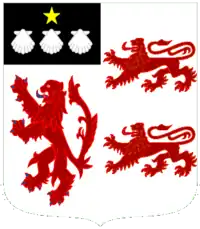 Dexter a lion sinister a heraldic antelope both Gules the latter ducally gorged lined armed and unguled Or and each charged with a mullet Or for difference.[5]