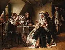 A painting of Peg Woffington visiting a poet called Triplel, painted by Rebecca Solomon, 100 years after the death of Woffington.