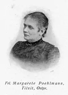 At the beginning of the twentieth century, Poehlmann began to work in the Women's Rights Movement. From 1906 until 1919, she served as a member of the board of the Allgemeiner Deutscher Lehrerinnenverein (General German Association of Female Teachers), which included consulting the Prussian State Government during a reform of girls' schools.[4] Until her death, she was the chairwoman of the Federation of East Prussian Women's Associations (Verband Ostpreußischer Frauenvereine), which she founded and included 25 associations with a total of more than 5,000 members.[5] The focus of her work was not suffrage, but education for girls and women, a topic on which she wrote numerous books and articles.[4] In Tilsit, she ran a successful career consultation office for young women.[6]