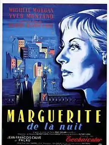 Marguerite de la nuit (US title: Marguerite of the Night) is a 1955 French language motion picture fantasy drama directed by Claude Autant-Lara, and written by Ghislaine Autant-Lara (screenplay & dialogue) and Gabriel Arout (adaptation), based on novel by Pierre Dumarchais. The film stars Michèle Morgan and Yves Montand.