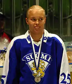 She was selected to play for Finland in the 2007 IIHF World Championships, where she registered a goal and an assist in Finland's five games. At the 2008 IIHF World Champhionships, she scored three goals and two assists and was voted Team Finland's Most Outstanding Forward.[6]