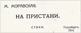 In early 1914, the first almanac of poems by Moravskaya named "На пристани" (On the Pier) had been issued. Expert in literature Razumnik Ivanov-Razumnik, several months before the publication of this almanac, had sent a draft of it to his authoritative colleagues including Andrei Bely and Valery Bryusov.[2] The last by Razumnik's request had written a preface named "Объективность и субъективность в поэзии" (The Objectivity and The Subjectivity in Poetry) for Maravskaya's almanac. But that preface remained unpublished as Moravskaya insisted on; she wrote to Bryusov: