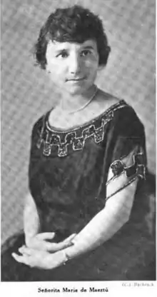 María was the fourth of five children born in Vitoria the capital of the Basque province of Álava. Her father, Manuel de Maeztu Rodriguez was a Cuban engineer and landowner from Navarre who had met her mother, Joan Whitney, the daughter of a British diplomat in Paris, when she was sixteen. Maria's parents never married.[1] In 1889 the unexpected death of her father in Cuba led to confusing administrative problems and the family was left in ruins. Her mother, a fragile but enterprising woman with a strong personality, took her three sons and two daughters to Bilbao and, in 1891, set up a residential school for girls to study French and English and improve their cultural skills. María started teaching at her mother's Anglo-French academy and then began to teach in the public schools of Bilbao. In 1903 she accepted the Ayuntamiento of Bilbao's post as director of the newly established night school for adults and also served as director of kindergarten (1902–1912). She created summer school colonies and focused on secular education which garnered her many enemies. Her fame became so widespread that, despite her youth, she was invited to share the stage with Concepción Sáiz, Miguel de Unamuno and other academicians at the Exposición escolar de Bilbao (Exhibition of Scholars) in 1905.[2]