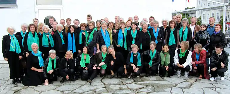 The Con Brio choir in Poland June 2009. Marianne Clausen is 3rd from left in front row, with cigarette.