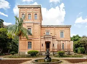 Situated in a park of 78,000 m2 (19 acres), the building was designed and built in the Renaissance style by the German architect, Carlos Augusto Gambs,[2] head of the Estrada União e Indústria's engineers and architects. The building reflects an imposing style that was characteristic of buildings of this era, and was built on a raised plateau using large bricks. The interior features stucco and hardwood paneled walls adorned with various paintings. The Villa still preserves its primary external and internal characteristics from when it was built.