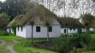 The large half-timbered building known as Skovridergården came from Vantore near Nysted. Dating from the late 1650s, it has been substantially modified over the years. When the curator was offered the building for the museum in 1924, he was uncertain about what he should do with it and where it should be placed. Rather than refitting it as a riding pavilion, its original function, for years it was furnished as a rural cottage. Since the 1970s, it has served as the museum's shop and café.[19]