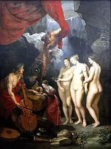 Education of the Princess (1622–1625) shows a maturing Marie de' Medici at study. Her education is given a divine grace by the presence of three gods Apollo, Athena, and Hermes. Apollo being associated with art, Athena with wisdom, and Hermes the messenger god for a fluency and understanding of language.[38] Hermes dramatically rushes in on the scene and literally brings a gift from the gods, the caduceus. It is generally thought that Hermes endows the princess with the gift of eloquence, to go along with the Grace's gift of beauty. However, the caduceus, which is seen in six other paintings in the cycle, has also been associated with peace and harmony. The object may be seen as foretelling of Marie's peaceful reign.[39] It can be interpreted that the combined efforts of these divine teachers represent Marie's idyllic preparedness for the responsibilities she will obtain in the future, and the trials and tribulations she will face as Queen.[40] It is also suggested that the three gods, more importantly, offer their guidance as a gift that allows the soul to be "freed by reason" and gain the knowledge of what is "good" revealing the divine connection between the gods and the future Queen.[41] The painting displays an embellished Baroque collaboration of the spiritual and earthly relationships, which are illustrated in a theatrical environment.[42] Acting as more than just static symbols the figures portrayed take an active role in her education. Also present are the three graces, Euphrosyne, Aglaea, and Thalia giving her beauty.[38]