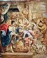 Much speculation exists on the exact circumstances under which Marie de' Medici decided to commission Rubens to paint "such a grandiose project, conceived in truly heroic proportions".[2] John Coolidge suggests the cycle may have even been commissioned to rival another famous series of Rubens, The Constantine Tapestries, which he designed in his studio at the same time as the first several paintings of the Medici Cycle.[3] It has also been suggested that Rubens prepared a number of oil sketches, by the request of Louis XIII, the son of Marie de' Medici and successor to the throne, which may have influenced the Queen's decision to commission Rubens for the cycle by the end of the year 1621.[2] The immortalizing of her life, however, seems to be the most apparent reason for the Queen's choice to commission a painter who was capable of executing such a demanding task. Peter Paul Rubens had already established himself as an exceptional painter and also had the advantage of sustaining close ties with several important people of the time, including Marie de' Medici's sister, the wife of one of Rubens's first important patrons, the Duke of Gonzaga. The information about the commission in the contract Rubens signed is far from detailed and focuses mainly on the number of pictures in the cycle dedicated to the Queen's life, and is far less specific when it comes to the cycle praising her husband Henry IV.[4] The contract stated that Rubens was to paint all the figures, which presumably allowed him to employ assistants for backgrounds and details.[5]