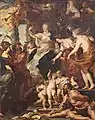 The Wedding by Proxy of Marie de' Medici to King Henry IV (1622–25), Rubens depicts the proxy marriage ceremony of the Florentine princess Marie de' Medici to the King of France, Henry IV which took place in the cathedral of Florence on 5 October 1600. Cardinal Pietro Aldobrandini presides over the ritual. As was often the case with royal weddings, the bride's uncle, the Grand Duke Ferdinand of Tuscany stood in the King's place and is pictured here slipping a ring on his niece's finger. All the surrounding figures are identifiable, including the artist himself. Although he was present at the actual event twenty years earlier, as a member of the Gonzaga household during his travels in Italy, Rubens appears youthful and stands behind the bride, holding a cross and gazing out at the viewer. It is highly unlikely that Rubens actually had such a pronounced presence in this scene when it took place. Those who attended the ceremony for Marie include Grand Duchess Cristina of Tuscany and Marie's sister Eleonora, Duchess of Mantua; and in entourage of Grand Duke are Roger de Bellegarde, Grand Esquire of France, and the Marquis de Sillery, who negotiated the marriage. As in other scenes in the Medici Cycle, Rubens includes a mythological element: the ancient god of marriage, Hymenaios wearing a crown of roses, carries the bride's train in one hand and the nuptial torch in the other.[48] The scene takes place below a marble statue, which depicts God the Father mourning over the dead body of Christ, alluding to the Pieta sculpture by Baccio Bandinelli (1493–1560).