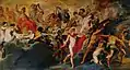 The Council of the Gods is one of the least understood paintings of Marie de' Medici cycle. It represents the conduct of the Queen and the great care with which she oversees her Kingdom during her Regency. For example, how she overcomes the rebellions and the disorders of the State. It also suggests that she perpetuated the policies and ideals of the late King in his life and in death.[75] The painting subjects are placed in a celestial setting which doesn't give way to a particular place, time or event. The scene is painted with a variety of mythological figures. This, along with its setting makes it difficult to figure out the subject matter of the work. The mythological figures include Apollo and Pallas, who combat and overcome vices such as Discord, Hate, Fury, and Envy on the ground and Neptune, Pluto, Saturn, Hermes, Pan, Flora, Hebe, Pomono, Venus, Mars, Zeus, Hera, Cupid, and Diana above.[76] The mythological figures and celestial setting act as allegories for Marie's peaceful rule over France.[77]