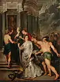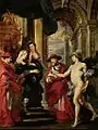 Rubens's The Queen Opts for Security represents Marie de' Medici's need for security through a depiction of the event when Marie de' Medici was forced to sign a truce in Angers after her forces had been defeated at Ponte-de-Ce. Though the painting shows Marie de' Medici's desire for security with the representation of the Temple of Security, the symbols of evil at bay, and the change of smoky haze to clarity, there is also underlying symbolism of unrest to the acceptance of the truce. The round shape of the temple, like those built by the ancients to represent the world, and has an Ionic order that is associated with Juno and Maria herself. The temple defines itself, by also including a plaque above the niche that says "Securitati Augustae" or For the Security of the empress.[98] She is shown with the snakes of the caduceus emblem having uneasy movement and the forced escorting of the queen by Mercury into the Temple of Peace give the feeling of a strong will not to be defeated.[99] It can also be debated that the painting is not really about peace or security, but really an unrelenting spirit that does not give into loss.[100] As she is a divine power, she is heroically depicted in a classical setting using neoplatonic hierarchy and visual cues of light on her face. These ultimately imply that this allegory of Marie de' Medici is an apotheosis.[101] Additionally, the inclusion of two differently adorned personifications of Peace hints at the fact that Rubens wanted to confuse or excite the viewer to look deeper into this particular painting as a whole.[98]