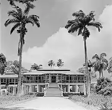 In 1745, Mariënburg was founded as a sugar plantation by Maria de la Jaille. After several owner changes, the plantation became a coffee plantation in the 19th century. In 1882, the plantation, which had been abandoned, was purchased by the Netherlands Trading Society (NHM).[2] The Society wanted to establish a central sugarcane factory, which had to be able to handle the surrounding plantations. To support the incoming supply of sugarcane, a 12 kilometres (7.5 mi) railway was built, the first railway in Suriname.[3] On 23 October 1882, the cane processing factory opened. Soon after, one of the plantations dropped out, and the remaining production was not worthwhile. The NHM bought the plantations to keep the vast supplies of sugar running. On Mariënburg itself, sugarcane was also planted.[2]