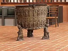 • A bronze baptismal font made by Hans Apengeter (1337). Until 1942 it was at the west end of the church; it is now in the middle of the chancel. It holds 406 litres (89 imperial gallons; 714 imperial pints), almost the same as a Hamburg or Bremen beer barrel, which holds 405 litres (89 imperial gallons; 713 imperial pints).[10]