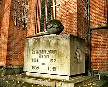 The glass window in one of the chapels has an alphabetic list of major towns in the pre-1945 eastern territory of the German Reich. Because of the destruction it suffered in World War II, St. Mary's Church is one of the Cross of Nails centres. A plaque on the wall warns of the futility of war.