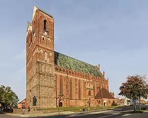 From 1289 to 1340, the new church was built as a three-aisled Gothic hall church in the brick Gothic style, incorporating the western part of the predecessor building of fieldstone masonry. The spacious church with seven baies is 56 metres long, 26 metres wide and 22 metres high; the ridge of the roof is now 43 metres high. It was built in two sections, the boundary of which runs by the stair towers. It has a relatively flat, apsidal east end for each nave.