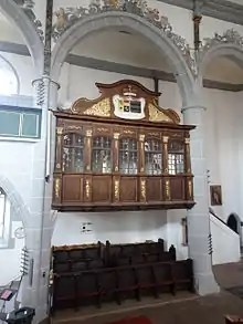 The self-contained Fürstenstuhl for the church's noble patrons, the Princes of Solms-Hohensolms-Lich, is located opposite of the pulpit. It was built in 1714 and re-located to its present site in 1859. It is a closed lodge with five windows between wooden pilasters and arches and bears a label reading "1714" and a coat of arms from 1859. The church pews in the nave date to 1705. Below the Fürstenstuhl are the remaining early Renaissance choir pews, which were made in 1530 and were originally arrayed on both sides of the choir between the columns.[18] Behind the door of the doorway to the south gallery is a wooden board which served as a Henkerssitz, the special seat for the town executioner. This was meant to enable him to participate in the service although he was unclean.[31]