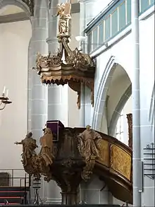 The baroque pulpit was made by the carpenters Diez von Engelthal and Seitz in 1767–1774. It is made in the shape of a eucharist chalice[27] and has five concave sides. The large sculpted figures on the pulpit were made by Franz Martin Lutz of Rockenberg. They depict the four Doctors of the Church, Bernard of Clairvaux, Thomas Aquinas, Bonaventure and Pope Leo I.[9] On top of the richly decorated canopy is a statue of Moses with the Ten Commandments. A dove symbolises the Holy Spirit. The wooden back wall, which once connected the pulpit and the canopy now hangs in the southwestern ambulatory.[28] The connected Neo-Gothic Pfarrstuhl dates from the middle of the nineteenth century. The matching altar and the baptismal font are made out of white-veined, grey-black Lahn marble. The massive altar table rests on a curly support.[29]