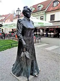 During the same year, Zagorka started working in Obzor, first as proofreader because the board of directors and editor-in-chief Šime Mazzuro objected to her for being a woman, but after bishop Josip Juraj Strossmayer's intervention, as a journalist, although she had to sit in a separate room so no one would see her.[5] She mostly wrote on politics, and occasionally travelogues from Zagorje, biographies, autobiographies, feuilletons, humoresques, short stories and novels in sequels.[1] On 31 October 1896, her first article in Obzor titled Egy Percz (Hungarian for One Brief Moment) was published. In the article, Zagorka wrote about the exclusive usage of the Hungarian language - which the majority of Croats didn't understand - at the train stations in Croatia, which is why passengers didn't know where the trains were going.[6] She later reported on political developments from the Croatian-Hungarian Parliament in Budapest and from Vienna, adding comments on politicians, and interviews and notes on unofficial political talks and general political atmosphere, which significantly contributed to the increase of Obzor's circulation.[1] After Obzor's editor-in-chief J. Pasarić and his deputy M. Heimerl were imprisoned in 1903 during Khuen-Héderváry's strongest oppression of Croats, Zagorka edited Obzor for five months by herself. A vocal opponent of magyarization and germanization of Croatia, she was imprisoned in solitary confinement for ten days for organizing demonstrations against Khuen-Héderváry. However, her editorial work in Obzor wasn't mentioned in 1936 Obzor's Memorial Book which deeply offended her.[7] During this time, she also wrote articles for Hungarian opposition newspapers Népszava and Magyarország.[3] In 1910, she participated in the founding of the Croatian Journalists' Association. During the same year, she married her fellow journalist Slavko Amadej Vodvařka. They divorced in 1914.[8]