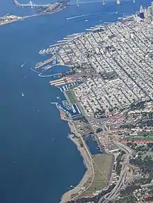 The Marina Green in San Francisco, California, is a 74-acre (300,000 m2) expanse of grass between Fort Mason and the Presidio. It is adjacent to San Francisco Bay, and this location provides good views of the Golden Gate Bridge, Angel Island, Alcatraz Island, and parts of Marin County. Houses built mostly in the 1920s and 1930s line Marina Boulevard, the southern boundary of the Marina Green. Many of these houses have large bay windows, and Herb Caen, the late San Francisco newspaper columnist, often made references to the immaculate furnishings behind these windows. In the past, a railroad track along the southern edge of the Marina Green allowed the San Francisco Belt Railroad to serve the Presidio. Adjacent to the Marina Green is a marina, home to the St. Francis Yacht Club and the Golden Gate Yacht Club. The San Francisco Bay Trail runs through the green.