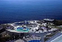 In early 2006, two small temporary sales offices replaced the abandoned gas station at the park entrance, and the large concrete sign along Palos Verdes Drive South (with a tower resembling a whale's tail) was altered to feature the logo and artist's impression of the resort. In July 2007, principal construction commenced, starting with the demolition of the remains of Marineland. The resort was completed in 2009.[9] Today, the Terranea Resort occupies the site, but pays tribute to the history of the location, including Marineland.[10]