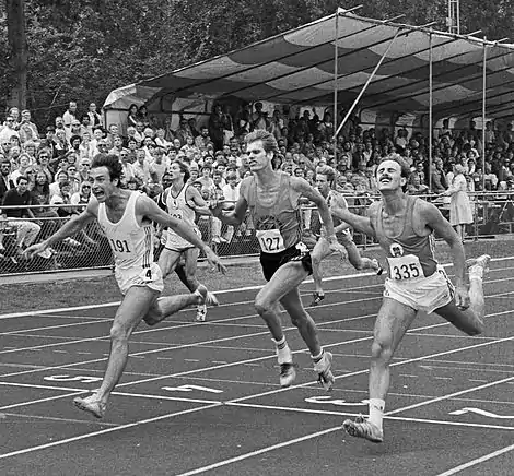 Finish of the Dutch 200 m championships in 1982. Left-right: Westbroek, Henk Brouwer and Marcel Klarenbeek