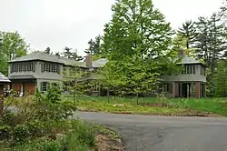 The Marion Nichols Summer House is located in a rural setting behind the Hollis school complex on the west side of New Hampshire Route 122 south of the village center. The main house is an L-shaped two-story wood-frame structure. It is stylistically eclectic, with Tudor Revival features (including diamond-paned windows), Craftsman elements, and Colonial Revival elements. The interior is finished in a somewhat rustic style, with vertical pine siding in the living room, and possibly recycled timbers in the ceiling. The property also includes a c. 1940 single-story structure which originally housed a workshop and a billiard room, and a small brick wellhouse built about the same time as the house.[2]